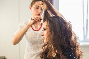 Close up of stylist’s hand using curling iron for hair curls.