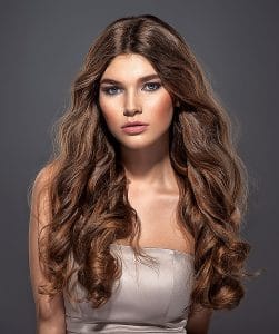 Sexy and gorgeous brown-haired woman with long curly hair.