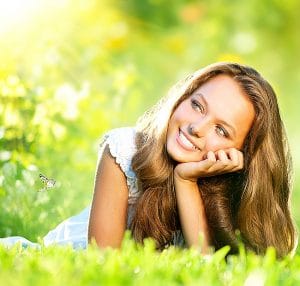 Spring Beauty. Beautiful Girl Lying on Green Grass outdoor
