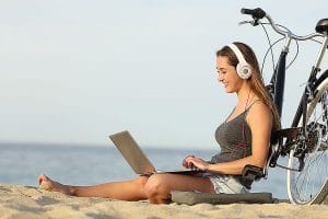 Teen girl studying with a laptop on the beach